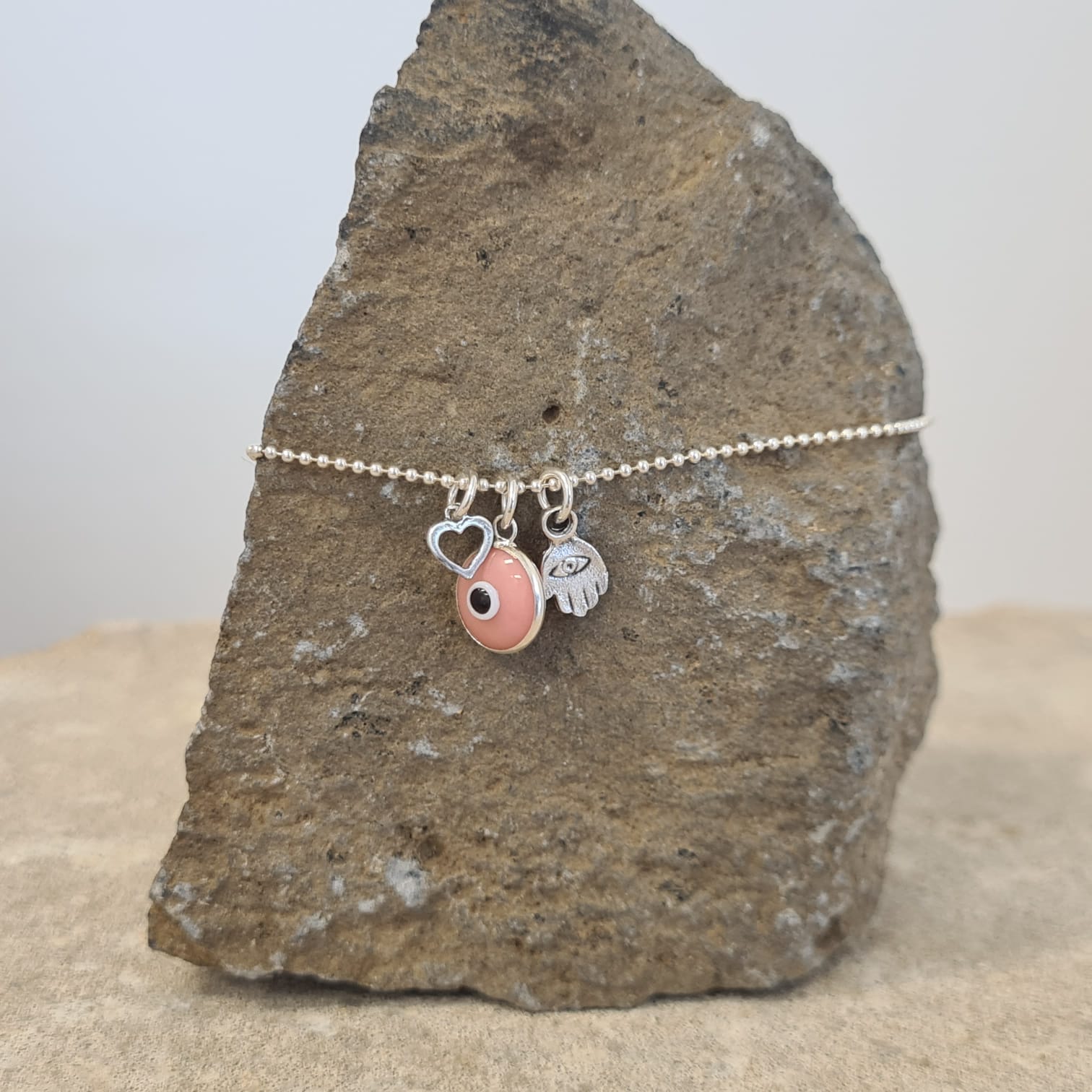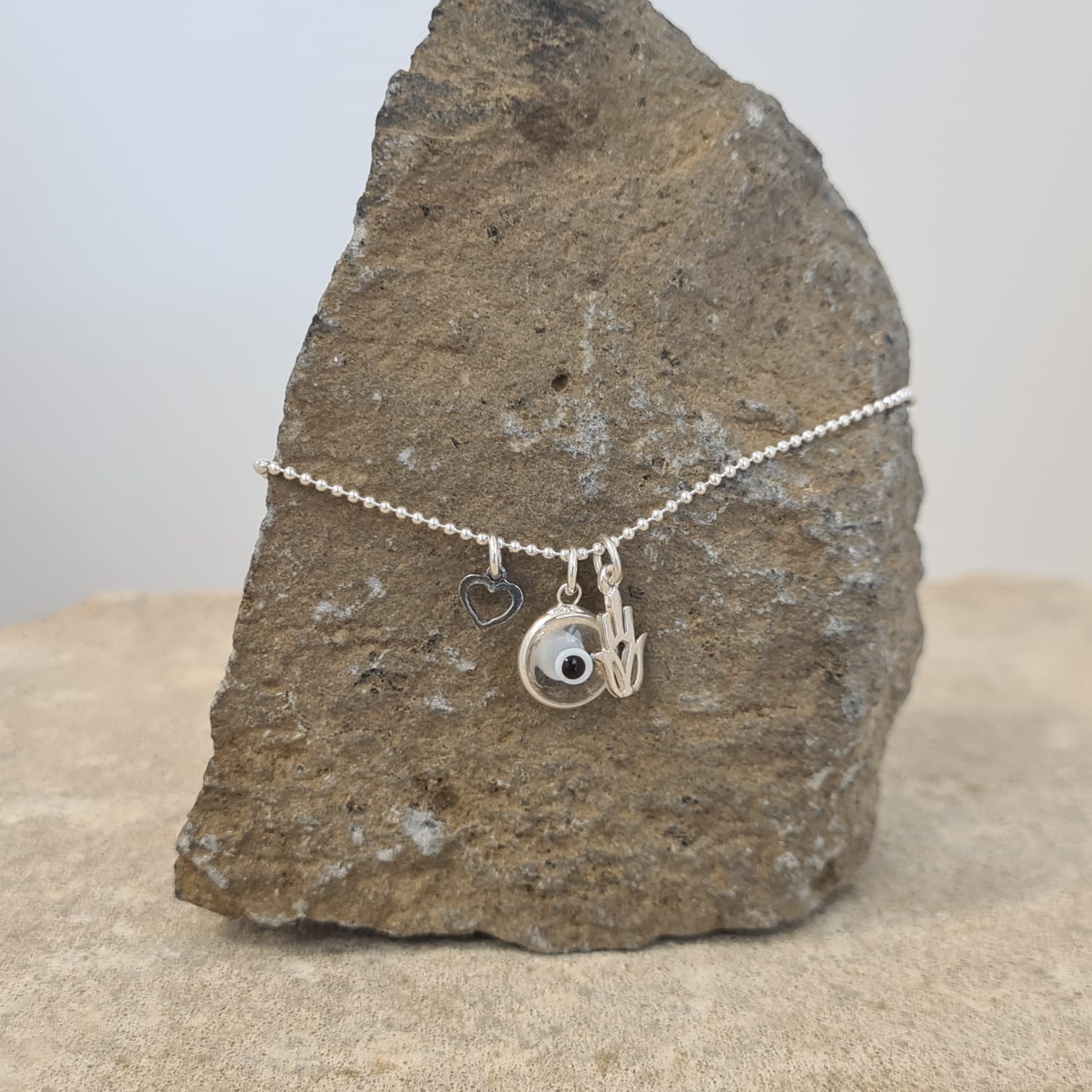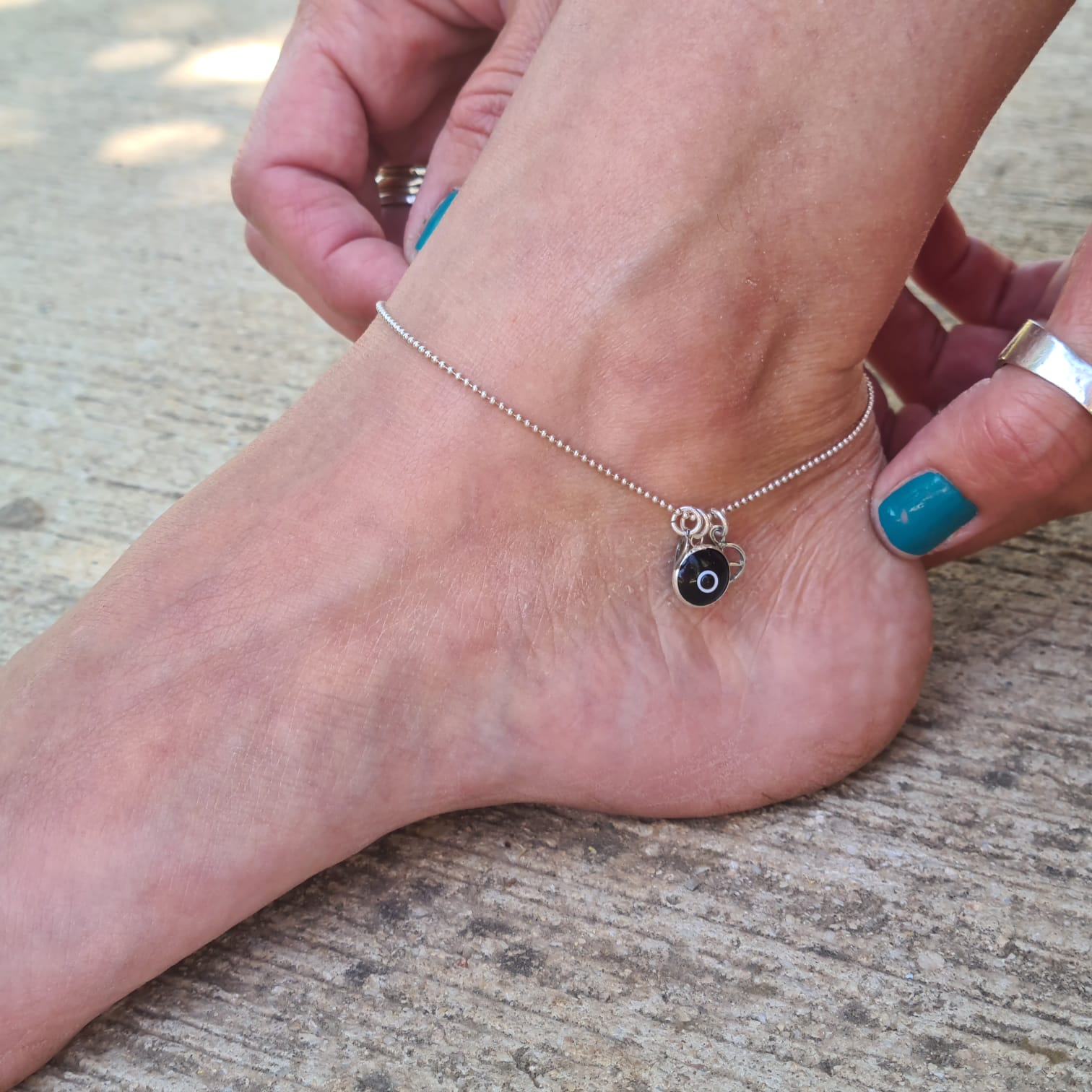 צמיד לרגל, מחוט דיסקית כסף 925, משולב עין צבעונית, ושני תליוני כסף לבחירה.